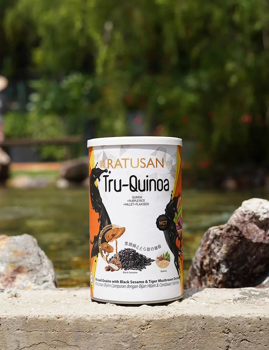 Tru-Quinoa is a comprehensive nutritious healthy meal replacement product that combines a variety of natural ingredients such as quinoa, black sesame, MCT oil, tiger milk mushroom and 18 types of grains. It is rich in protein, fiber, vitamins, and minerals to help provide complete nutritional support. Helps promote a healthy digestive system, stable blood sugar levels and cardiovascular health, it also provides long-lasting energy and antioxidant protection, making it ideal for maintaining a healthy lifestyle. What does it help with: Enhances Promotes Provides Complete Nutrition Improves nervous system Boosts Enhances respiratory function How to Consume Key Ingredients Black Sesame Millets Flaxseed Tiger Milk Mushroom Tricolor Quinoa Purple Sweet Potato Inulin 18 Grains